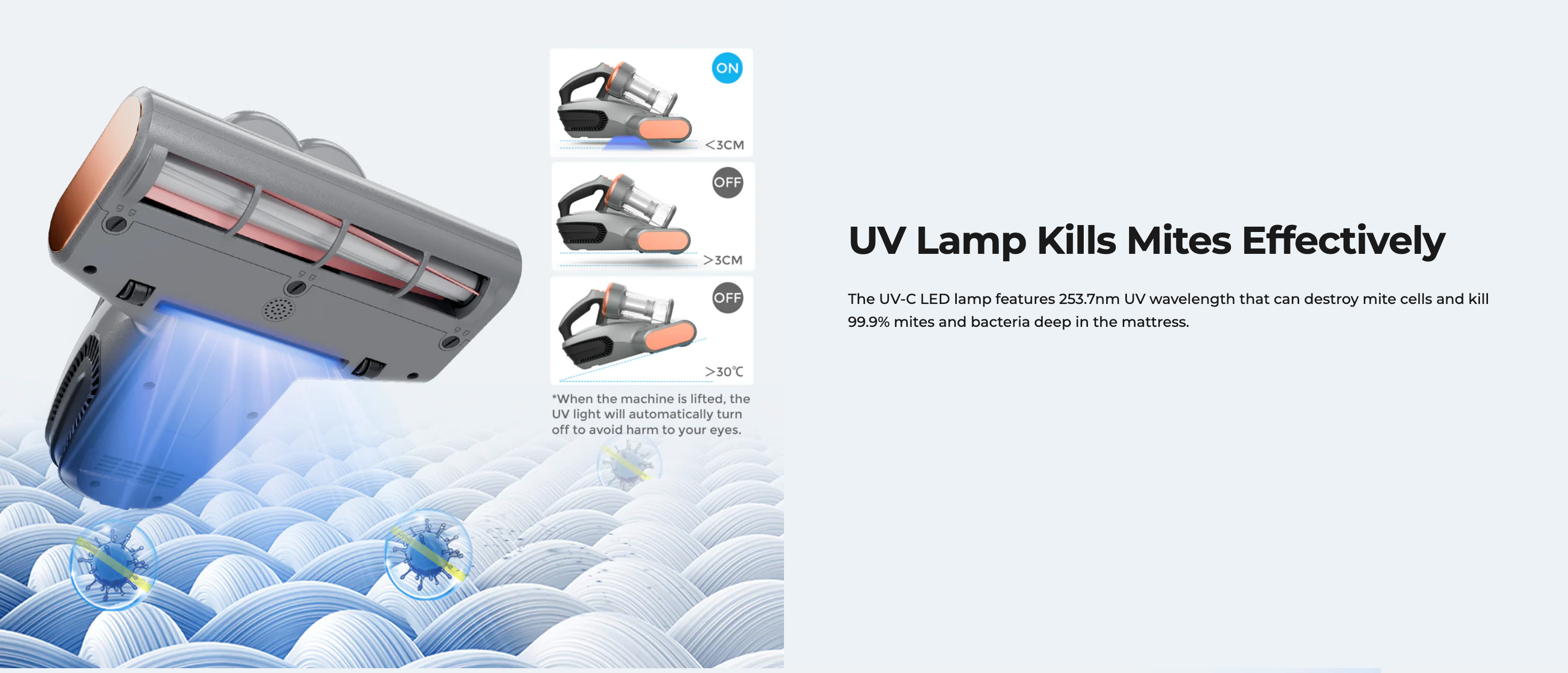 A diferencia de los aerosoles o productos químicos agresivos, la luz UV-C elimina el 99.9% de los ácaros del polvo y las bacterias de forma segura y natural . Esto se traduce en un ambiente más fresco y saludable para niños, mascotas y cualquier persona con alergias.